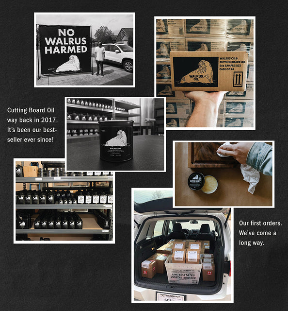It all started in a humble garage by a seasoned woodworker and culinary drop-out, serving the restaurant industry making handcrafted dining tables and accessories. In an effort to create safe and easy wood care products to help maintain his cutting boards and dining tables taking daily beatings in restaurants, Walrus Oil was born. Customers loved it, word spread, and since 2017, we've never looked back. Less than a year after brewing up our first twelve cans, we were churning out more oil than sawdust 100x over! Though we've grown a bit since the garage days, and Walrus Oil is now sold in thousands of stores nationwide, our mission and spunk is all the same.