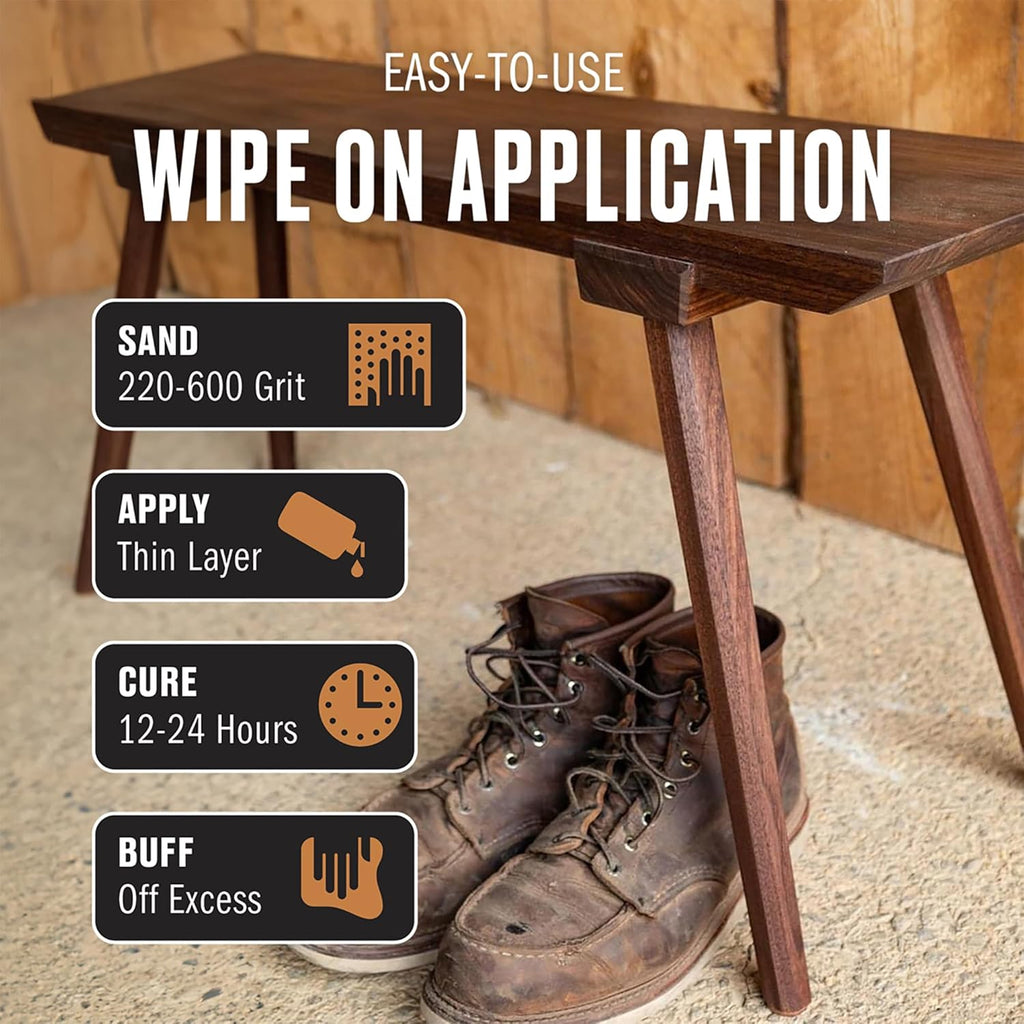 Prep unfinished surface by sanding at 220-600 grit. Shake bottle well, then apply thin layer of oil to entire surface. Allow 12-24 hours to dry then wipe away excess. For deeper penetration thin oil with a natural solvent. Apply multiple coats for stronger finish.
